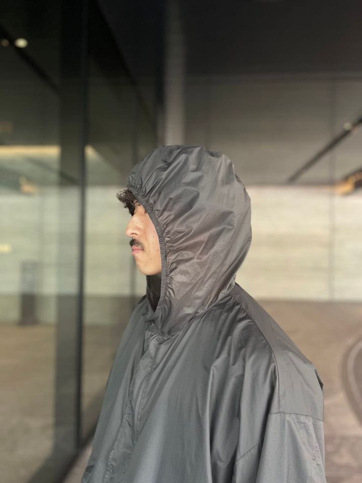 きちんとしたセットアップからストリートスタイルまで、その日の予定や気分に合わせて着こなしを決めるという岡本さん。梅雨は快適性を重視してアイテムを選ぶことが多いそう。「梅雨は雨風に対応できるだけでなく、気温も読みにくいので脱ぎ着がしやすいアウターが必須。そこで今回は、HYKE×ユナイテッドアローズのジャケットをセレクトしました。驚くほど薄い生地なので着心地も持ち歩きも軽くて快適で、バッグに入れてもノンストレスです」