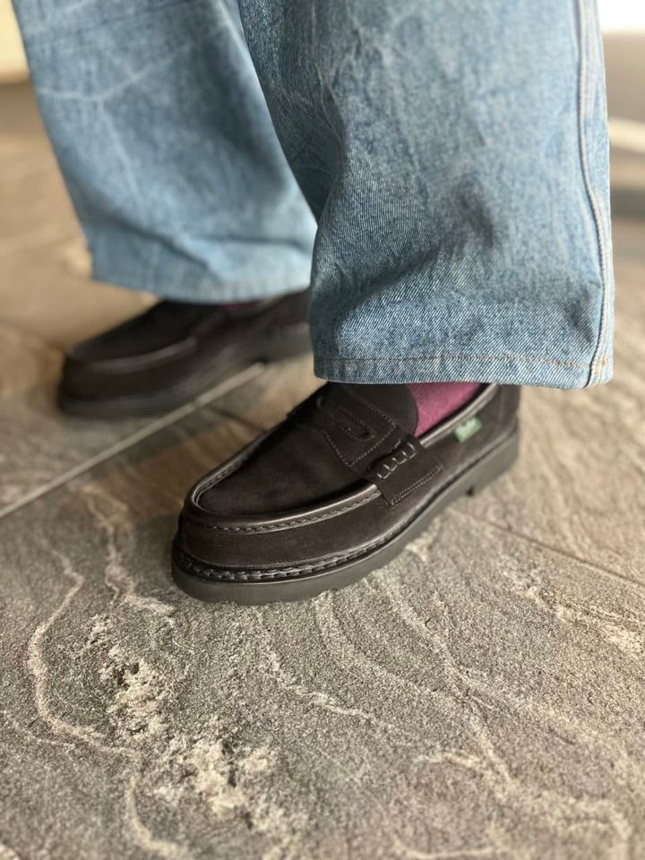 ハイク フォー ユナイテッドアローズのジャケット、ドリス ヴァン ノッテンのデニム、エイチ ビューティ&ユースのソックス、パラブーツのローファーは岡本さん私物