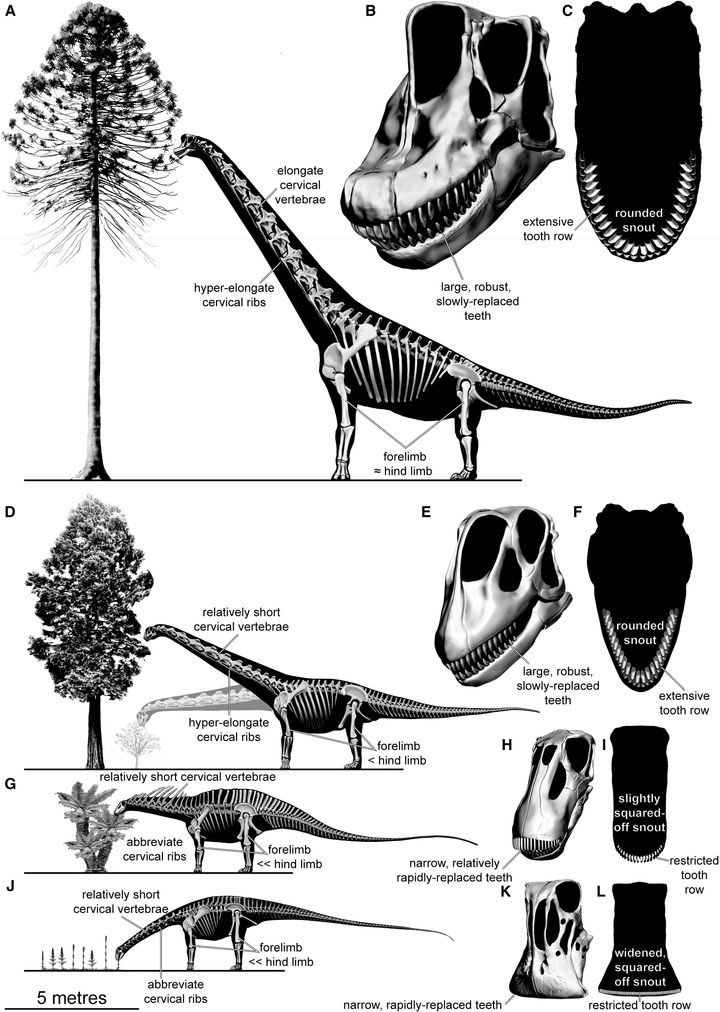 体格に合わせた竜脚類の食性の図解、それに対応する頭蓋骨の形状/ Credit: Stephen F. Poropat et al., Current Biology(2025)