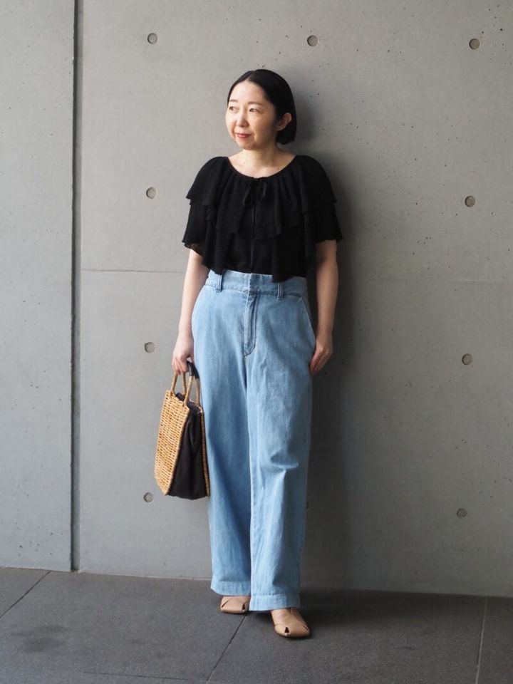 山野内さんが今季リアルバイした「アデュー トリステス」のフリルニットは、フェミニンな要素を詰め込みつつも、透け感のある軽やかな素材が特徴。引き締め効果のあるブラックとデニムとのマッチングで、甘すぎない大人バランスに仕上げています。淡いブルーでコントラストをきかせて、初夏にふさわしい爽やかな装いに。