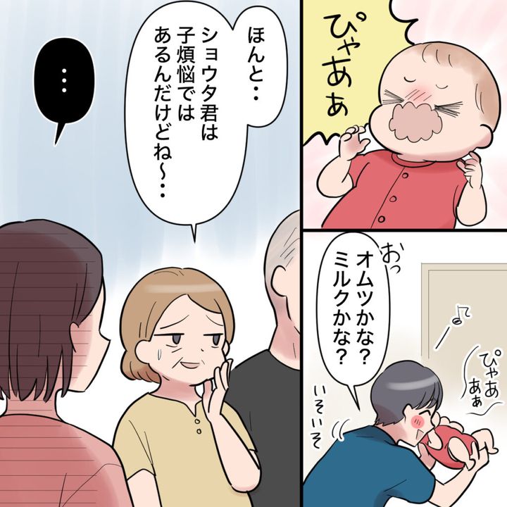 エイタが突然泣き出しても、嬉しそうに「オムツかな?ミルクかな?」と嬉しそうにいそいそとお世話をするショウタの姿を見て、両親は「ホント、ショウタ君は子煩悩ではあるんだけどね~」と言って苦笑い。