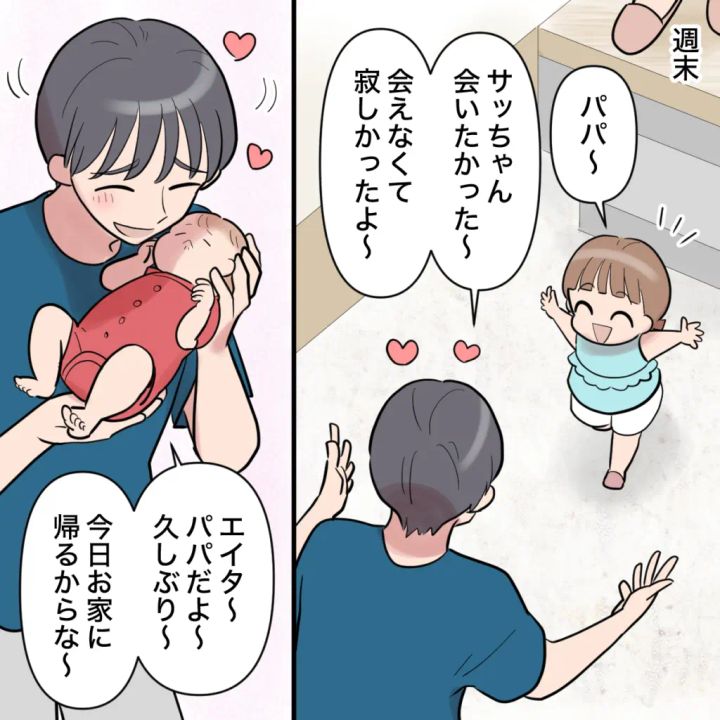 週末迎えに来たショウタを、サッちゃんは満面の笑みで迎えました。エイタにも、「パパだよ~、久しぶり~。今日お家に帰るからな~」と、子ども達2人に分け隔てなく愛情を注ぐショウタ。