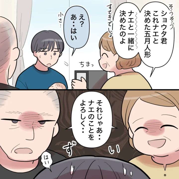 帰宅の際、私の両親は小さなケースに入った五月人形をショウタに渡しました。「これ、ナエと決めた五月人形。ナエと一緒に決めたのよ、ステキでしょ~」と強調。そして笑顔ながらも「それじゃあ、ナエのことをよろしく」と、かなり圧をかけてしっかりとくぎを刺してくれました。