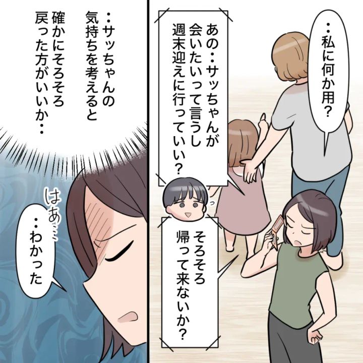 夫ショウタへの信頼がなくなり、子どもたちを連れて実家に帰っていましたが、サッちゃんは大好きなパパに会いたくて電話をかけることになってしまいました。「サッちゃんが会いたいって言うし、週末に迎えに行っていい?そろそろ帰って来ないか?」と言うショウタに、本当はNOを突きつけたい気持ちでしたが、サッちゃんのことを考えるとそろそろ帰った方が良いと思ったのも事実。ひとつ溜息をつき、「わかった」とだけ答えました。