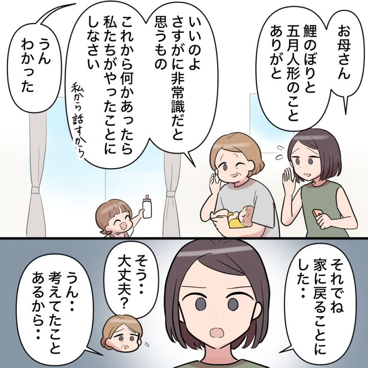 私に代わって、息子エイタとはまるで違う名前旗をつけて送られてきた五月人形と鯉のぼりをショウタの実家に送り返すことを伝えてくれた母に感謝しました。母もさすがに非常識だと思っているのです。母がいつも味方になってくれて心強い気持ちでした。
