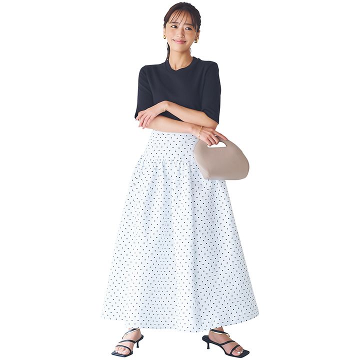 シンプルな黒Tにボリュームのある白のフレアスカートを合わせれば涼やかさがグッとアップ。控えめなドットスカートなら華やかさを添えてくれます。