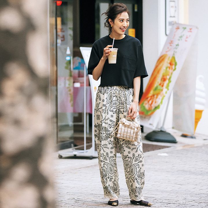 トレンド感もある ゆる柄パンツで シンプルな黒Tが華やぐ