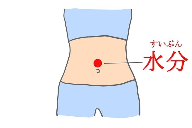「水分」は水分代謝に働きかけてむくみなどを解消する効果が期待できるツボ。おへそから親指の太さ1本分上のところにあります。両手の指先を重ね、5秒かけて押しましょう。