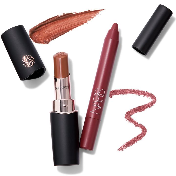 左:濃密なブラウンにローズのニュアンスが溶け込み、顔印象を引き締め、肌まで美しく魅せるダークリップ。深い輝きと潤いで心地よさが長続きし、洗練の表情に。DECORTÉ ルージュデコルテ クリームグロウ 23G rosewood ¥5,500(コスメデコルテ)右:クリームからマットに変化する心地よいテクスチャーで、ラインも描きやすいクレヨン型。長時間持続する濃密マット処方、高揚感まで引き出す魅力的な赤褐色です。パワーマット ハイインテンシティ リップペンシル 181 ¥4,400(NARS JAPAN)