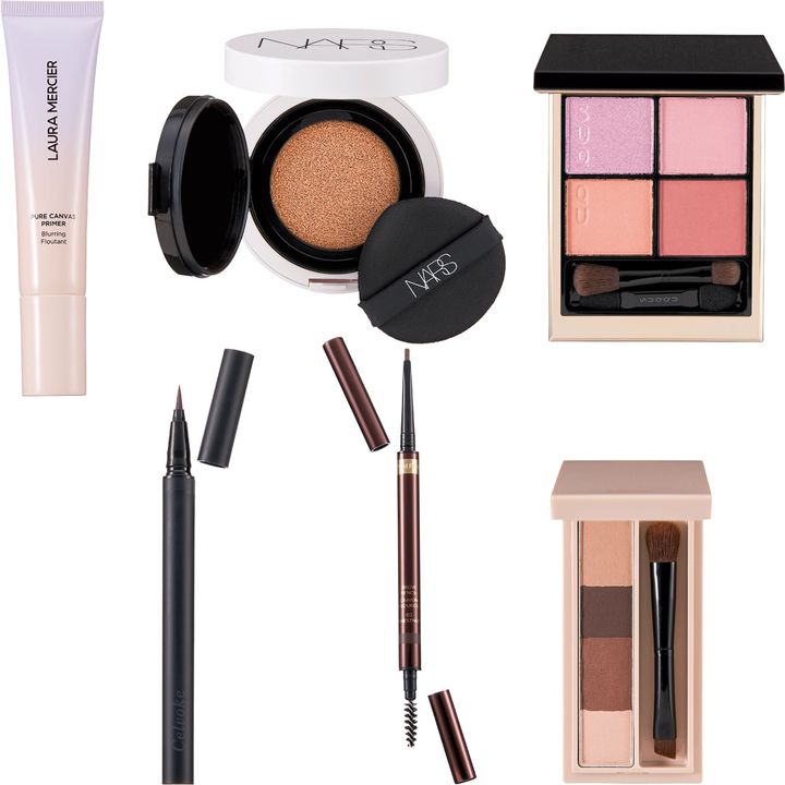上段左から:毛穴をふんわりとぼかしファンデのもちもよくなるメーク下地。ローラ メルシエ ピュア キャンバス プライマー プラーリング N 30ml ¥5,610(ローラ メルシエ ジャパン)透明感のある澄んだ肌印象に。NARS ライトリフレクティング セラムクッションファンデーション 03795 SPF42/PA++ ¥8,580(セット価格)(NARS JAPAN)柔らかな表情を生み出す魅惑のパレット。シグニチャー カラー アイズ147 陽影 -HARUKAGE ¥7,700(SUQQU)下段左から:ブラウンベースのボルドーカラーが目元のさりげないポイントに。セルヴォーク シュアネス アイライナーリキッド C 06 ¥3,080(Celvoke)自然な発色で一本 一本リアルな眉が描きやすく、顔の立体感も引き立てます。トム フォード ブロー ペンシル 03 チェスナッツ ¥7,920(トム フォード ビューティ)絶妙カラーのグラデーションで立体感のある美眉が完成。ヴィセ フラッフデザイン アイブロウパウダー BR-2 ブラウン ¥1,320※5/16発売<編集部調べ>(コーセー)