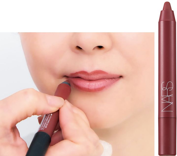 口紅と同系色のクレヨンタイプでまず下唇の中央部分の輪郭を取り、次に上唇の山を鋭角になりすぎないように描き、上唇の左右ラインは少しオーバー気味にふっくらさせながら口角へ繋げます。描いた輪郭はリップブラシで唇の内側に向かってぼかします。NARS パワーマット ハイインテンシティ リップペンシル 181 ¥4,400(NARS JAPAN)