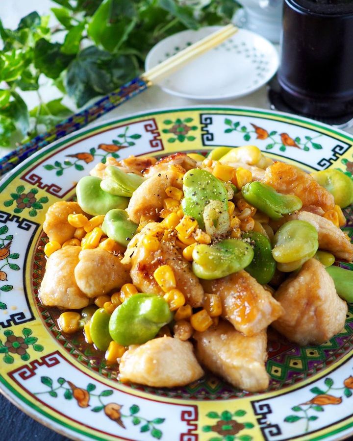 鶏むね肉と旬のそら豆を使った、スタミナうま塩炒め。