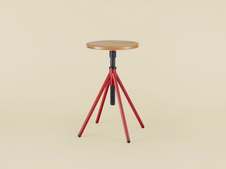おそらく日本のものだと思われるこのスツールは、色や素材に1990年代らしさが詰まった一品です。1980年代にはビビッドなカラーリングが流行し、樹脂などの石油製品が世の中を席巻していました。そこへ木材の座面を組み合わせたこのスツールは、当時のインテリアのトレンドの流れを感じさせてくれるもの。ネジによって座面の高さを調節することもでき、さまざまな用途に対応できる便利な日用品なのです。