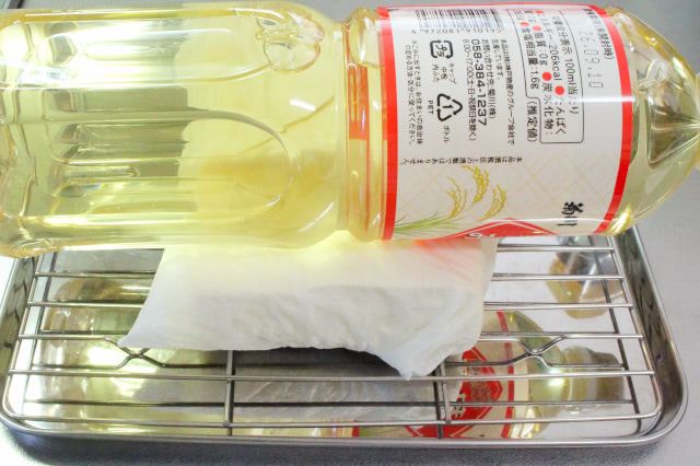 しっかりと水気を切るのがポイント。今回は、みりんの1Lボトルを乗せて、30分ほど水切りしました。