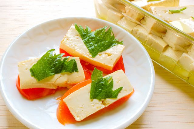 動画によれば、「豆腐のオイル漬け」はサラダのトッピングにしても合うそう。そこで今回は、トマトと青じそを合わせてカプレーゼ風にしてみました。