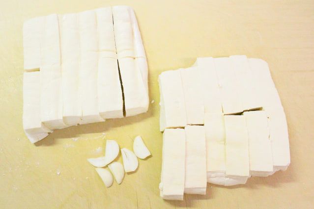 3. 豆腐を小さめのひと口サイズに切り、にんにくを薄切りにします。
