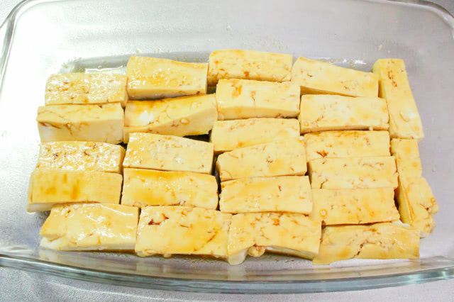 豆腐が重ならないよう、大きめの容器で調味料を混ぜてくださいね。調味料は豆腐が吸い切るくらいの少量なので、表面にも裏面にもしっかりと絡めました。