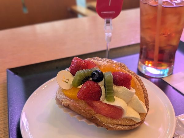 ふわふわのオムレット生地の中に、カスタードクリーム・バナナ・ぎゅうひ・粒あんが詰まっています。トッピングはたっぷりの生クリームとフルーツたち(イチゴ・キウイ・グレープフルーツ・ブルーベリー・オレンジ)。このオムパフェ一つでいろんな食感が楽しめるだけでなく、フルーツの酸味が合わさることで最後までペロッと食べられます。