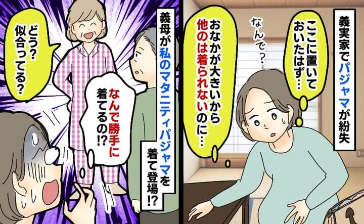 家族仲がいい義実家では、なんでも貸し借りをするのが当たり前。自分の服を他の兄弟が使うことは日常のようです。そんな中、ある年の連休に妊娠10カ月の私は義実家に泊まることになりました。しかし、持ってきたマタニティパジャマが見当たりません……。ふと見ると、そこには義母の衝撃の姿が!