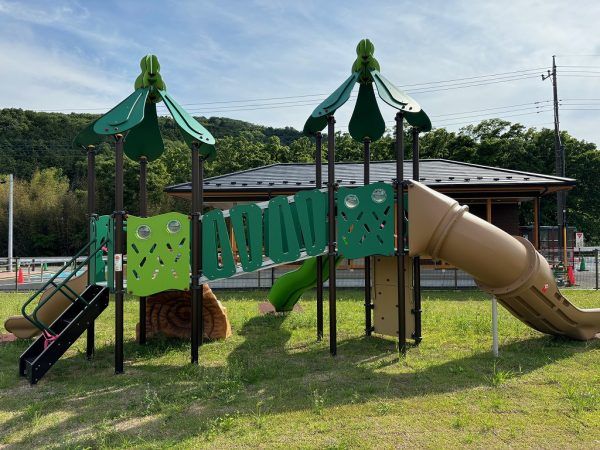 ふわふわドームや複合遊具がある「ふれあい広場」、今後は遊歩道も整備され、バーベキュー場の開設も