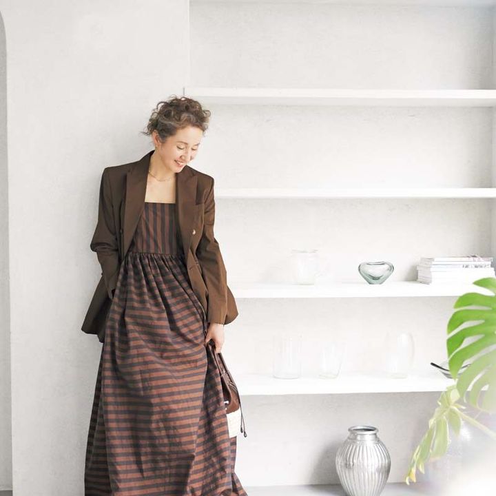 夏に向けて何色を着るのが気分だろう?と考えたとき、ふと思い浮かんだのがブラウン。なんとなく秋冬のイメージが強いかもしれませんが、素材やトーンを吟味すると、大人ならではのシックかつモードな初夏を演出してくれるからです。 今回は、光沢のあるナイロンや透け感のある生地、ダーク過ぎない色みを選んで、軽やかさを意識したコーディネートを組んでみました。 上の写真でで着用したボーダー×ストライプ柄のキャミソールワンピースは、ドレッシーなシルエットをシャカシャカとしたポリエステルナイロン素材でカジュアルダウンさせた1着。そのまま着るのも素敵ですが、肌の露出が気になる方もいらっしゃると思うので、綿100%のテーラードジャケットを羽織りました。異素材を合わせることでスタイルに奥深さが生まれ、ワンピースの甘さも調整でき、ハンサムな女性らしさを漂わせることができます。 首元と足元で肌見せして抜け感を作ったり、ゴールドのネックレスでさりげないアクセントを添えたのもポイントです。