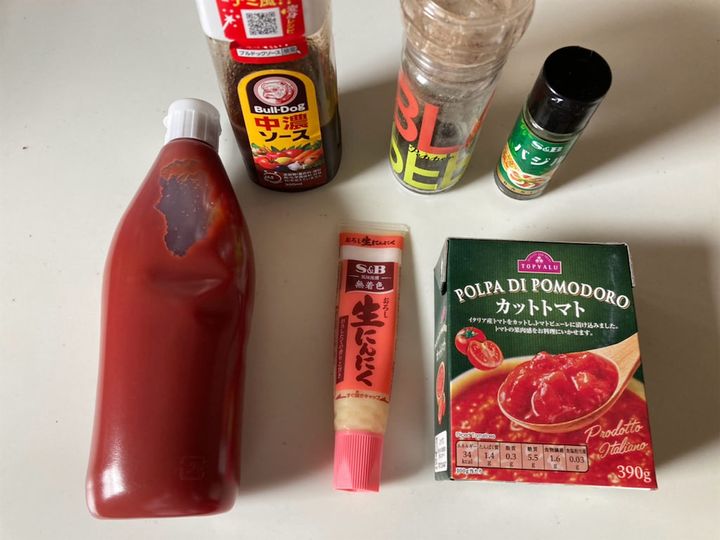 そこに、ケチャップ、中濃ソース、黒こしょう、乾燥バジルを入れて、ひと煮立ちさせれば完成!