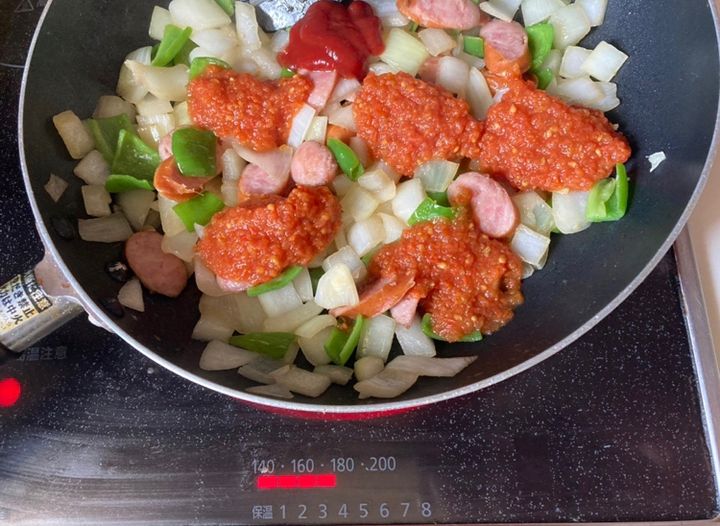 玉ねぎがしんなりとしてきたら中火にして、ピザソース、ケチャップを加えます。