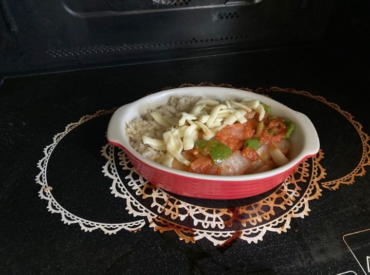 ご飯とナポリタンソースを耐熱容器に入れたら、上にピザ用チーズをのせて、600Wのレンジで1分程度加熱します。
