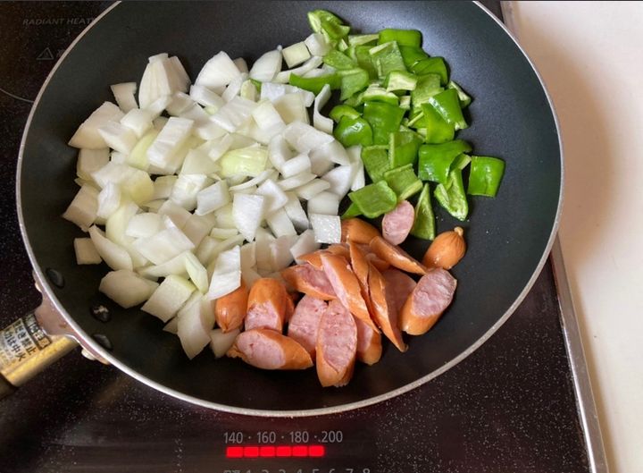フライパンに角切りにした玉ねぎとピーマン、スライスしたウインナーを入れて強火で炒めます。油は入れなくても、ウインナーから脂が出るので大丈夫です。