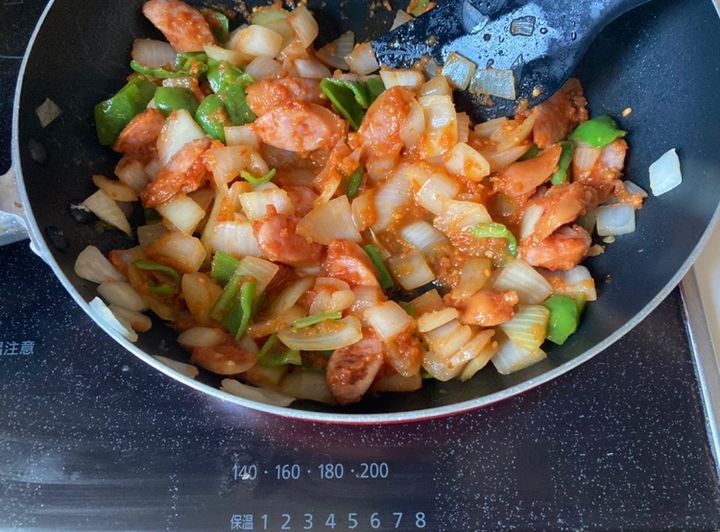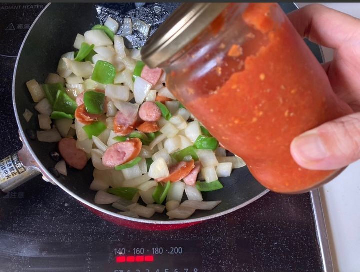 ※ピーマンは小松菜や茹でたほうれん草でもOK。ウインナーもハムやベーコン、豚ひき肉などで代用可能です。玉ねぎ、ピザソース、ケチャップは、味を決める役割があるので必須です♪