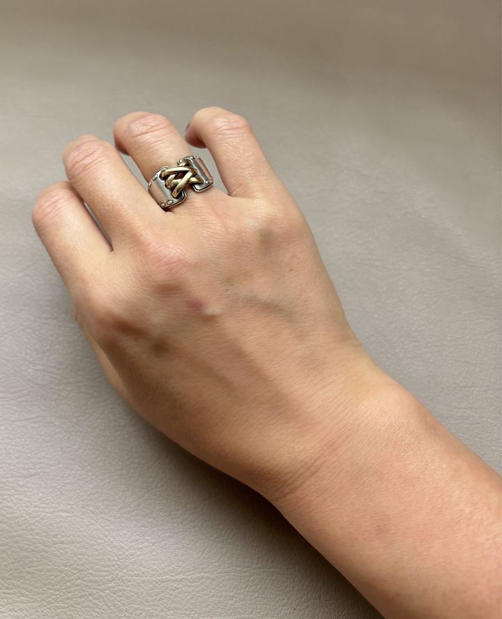 どんなタイミングにいくらくらいで買ったのかまったく覚えていないのですが、私のファーストエルメスがこちらの「メキシコ」リング。若い頃に大好きで集めていた、シルバー×イエローゴールドのコンビです。最近はMIXコーデをしない私ですが、このリングを見るとかつては取り入れていたことを思い出させてくれ、ジュエリーコーデの変遷を感じられます。何十年もおうちで眠っていた“勝手にヴィンテージ”ジュエリーですが、久しぶりに見てもやっぱり素敵! 辛口マニッシュなシルバーブレスにも、ゴールドのチェーンブレスにも似合います。