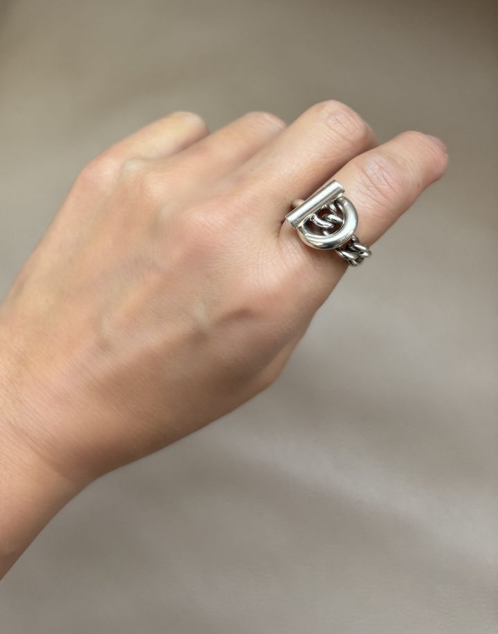 エルメスのシルバージュエリーを揃え始めるきっかけになったリング。立ち寄ったハワイのショップで「今、全米で在庫がひとつだけ」と言われたうえ、そのリングがシンデレラフィット。これは運命だなと思い即決しました。