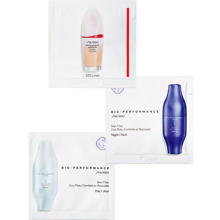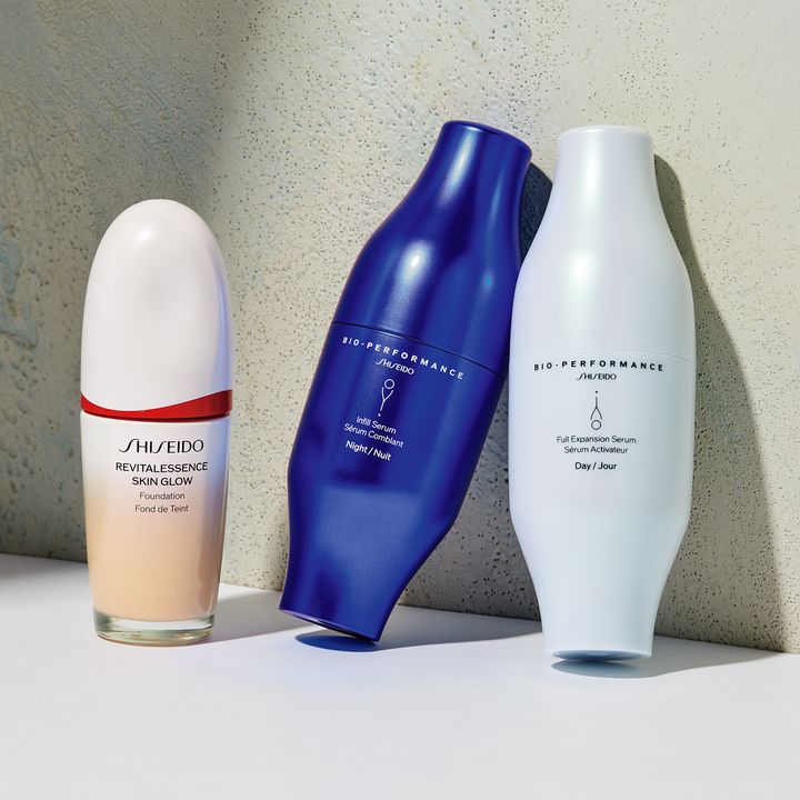 左:大ヒット中のファンデは試してみたかった人も多いはず!美容液の中にファンデを包む「ファンデ美容液」発想で、圧倒的うるおいとツヤを叶えます。どんな人にもなじむ220番のカラー、Linenをセレクト。SHISEIDO エッセンス スキングロウ ファンデーション 220 SPF30・PA+++ 30ml ¥7,590、中・右:編集部内でも「保湿革命」と呼ばれた朝晩の美容液。夜の美容液でヒアルロン酸を入れ、朝の美容液でそれを膨らませるという驚きの技術を搭載。SHISEIDO ビオパフォーマンス スキンフィラー<朝用美容液・夜用美容液>各30ml ¥36,300(すべてSHISEIDO)