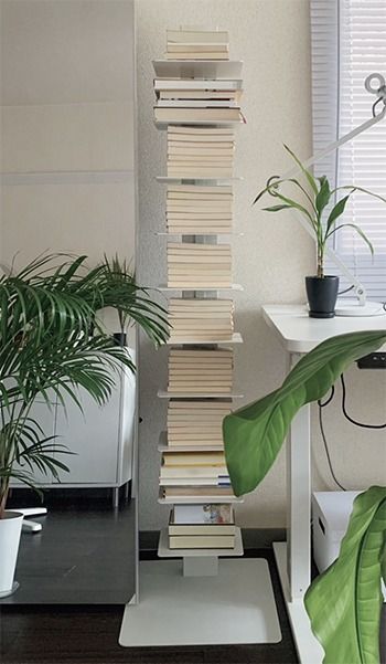 自宅を仕事場としても使っているため、騒がしくない居心地のよい空間をめざしています。本好きが高じて、部屋にはたくさんの本があるので、スペースをとらず大量に収納できるブックタワーを活用。観葉植物を複数置いてグリーンを部屋のアクセントカラーにしているため、その雰囲気をくずさないように、色が入ってきやすい背表紙は見せないように。(runさん・デザイナー)