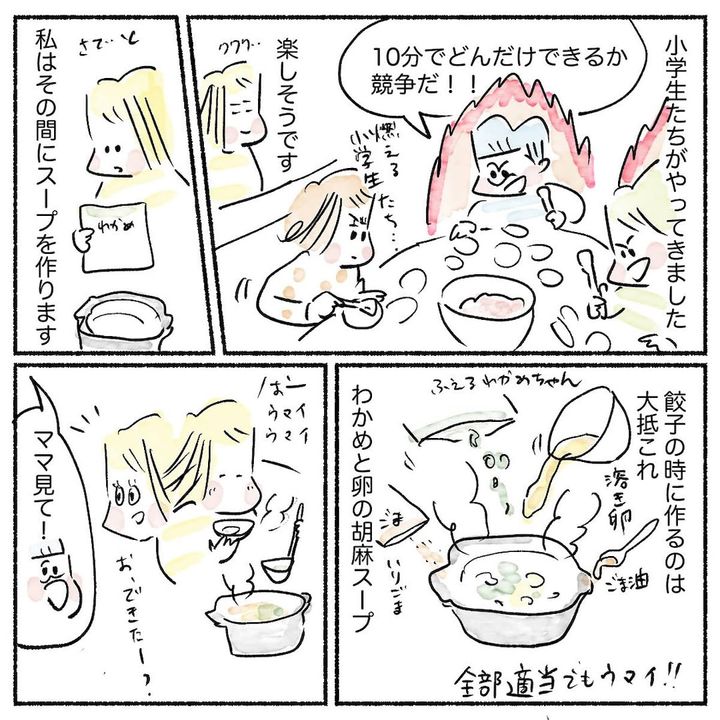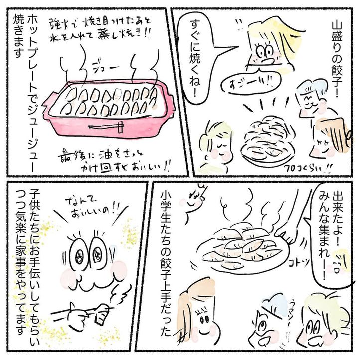 こんにちは!4児の母で漫画家兼公認会計士のAyumiです。わたしの場合、幸い在宅勤務を取り入れられて、家事と仕事のバランスがうまく取れているところです。平日でも、餃子のような手間のかかる献立に、果敢にチャレンジしてますよ!とは言っても、合計70個にも及ぶ餃子の皮、さすがに自分では包まず…子どもたちにお任せ(笑)。大家族ならではの晩ご飯の様子をご紹介しますね♪