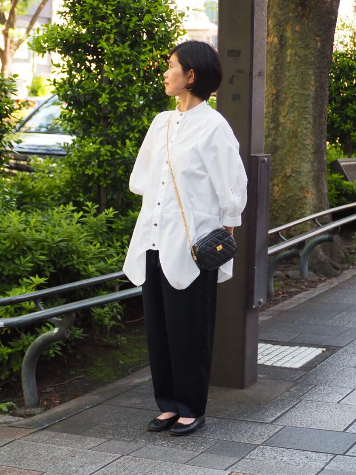 ハリのあるシャツにシルク風のパンツを合わせたクラシカルなスタイリングで颯爽と街を歩くかおりさん。「モノトーンのアイテムを選ぶことが多いので、ディテールが凝っているものが好きです」。この日は、「エンフォルド」の変形シャツがコーディネートの主役。シンプルな装いのなかに、さりげなく垣間見える遊び心にドキリ。