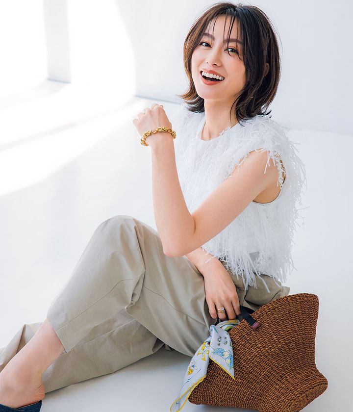 ジャケット¥47,300パンツ¥35,200(ともにウィム ガゼット/ウィム ガゼット 玉川髙島屋S・C店)ニット¥11,000(ELENDEEK)バッグ¥49,500(プンティ/エルディスト ショールーム)サンダル¥71,500(キャバン パトリシア ウルキオラ/CABaN Marunouchi)イヤリング¥32,400(アビステ)バングル〈YG〉¥96,800バングル〈PG〉¥198,000(ともにウノアエレ/ウノアエレ ジャパン)リング¥19,800(ピニャッタ/ZUTTOHOLIC)