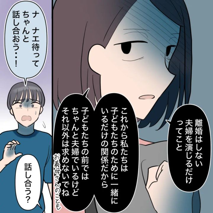 「離婚はしない。夫婦を演じるだけってこと。これから私たちは、子どもたちのために一緒にいるだけの関係だから。子どもたちの前ではちゃんと夫婦でいるけど、それ以外は求めないでね。お義母さんのことも」何の感情もなく無表情でそう言うと、「ナ、ナエ待って。ちゃんと話し合おう・・!」と言い出すショウタに、「話し合う?」と疑問を投げかける私。