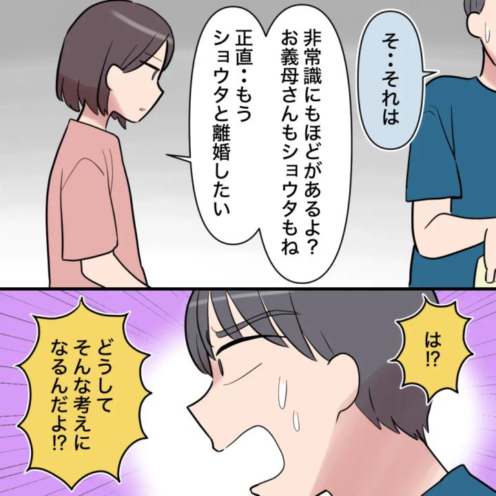 「そ・・それは」言葉に詰まるショウタに、「非常識にもほどがあるよ?お義母さんもショウタもね。正直・・もうショウタと離婚したい」と言うと、「は!?どうしてそんな考えになるんだよ!?」と驚くショウタ。