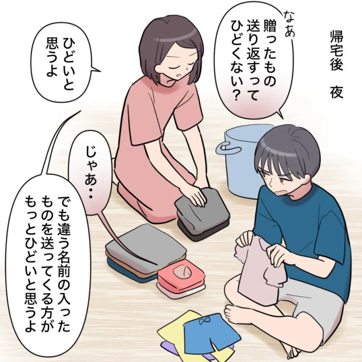 サッちゃんのためにと自宅に帰って来たナエさん。帰って来るなり「贈ったもの送り返すってひどくない?」と言い出すショウタさん。「違う名前の入ったものを送ってくる方がもっとひどい」と言い返したナエさんの言葉が正しすぎます!