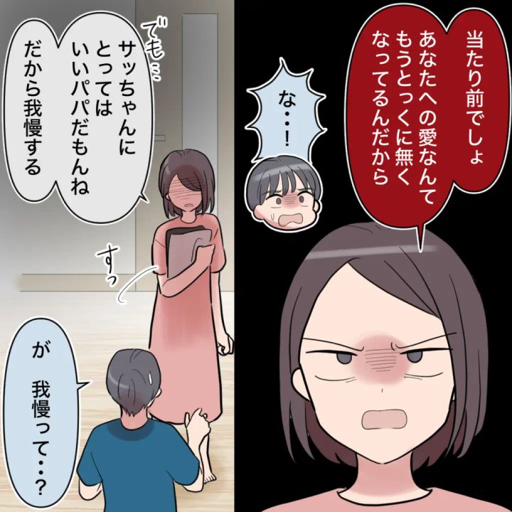 「当たり前でしょ。あなたへの愛なんて、もうとっくに無くなってるんだから」冷たくそう言うと、「な・・!」とショウタは呆然。「でも・・サッちゃんにとってはいいパパだもんね。だから我慢する」そう言ってその場から離れようとすると、「が、我慢って・・?」と何も理解していない様子のショウタに、