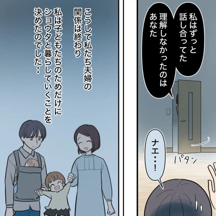 「私はずっと話し合ってた。理解しなかったのはあなた」そう言い捨てて部屋を出る私に、「ナエ・・!」とショウタが声をかけるも、私たち夫婦の関係は終わり、私は子どもたちのためだけにショウタと暮らしていくことを決めたのでした・・。
