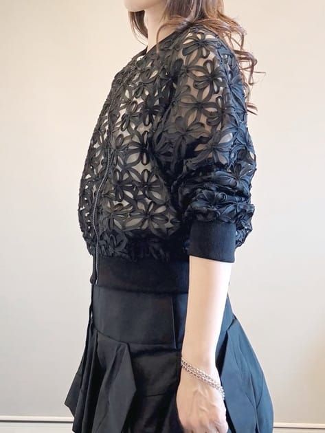 1.シフォン素材×立体的な花柄の「甘ブルゾン」