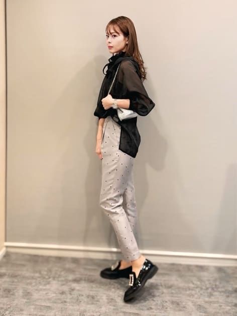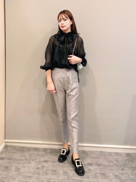 リボンとギャザーで上品に盛った黒シアーブラウスを、小粒ドットのテーパードパンツでほどよくカジュアルダウン。甘さ控えめな配色がブラウスの華やかさを際立たせます。おしゃれも快適も諦めたくない日の、頼れるオケージョンコーデです。