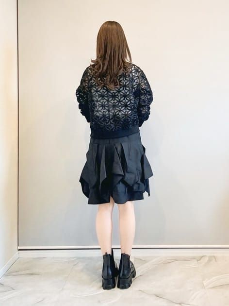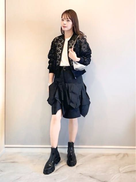 黒の透けブルゾンで重くならずに華やかさをON。ランダムフリルのスカートと合わせて、ほんのりモードな甘辛ミックスに。足元はボリュームブーツで引き締めて、都会的なお出かけスタイルに仕上げました。室内外の気温差が激しい日にも頼れる一枚です。