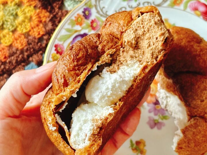 手で割ってみると、クリームもこもこ!!!溢れ出るのでは…!?と思うほどです。チョコクリームとホイップクリームの2層になっています。口の中もクリームいっぱいになります。かぶり付くと口からクリームがはみ出ちゃうのでお気をつけて!満足感ハンパない!!(笑)シュークリーム好きな人にとっては夢のようですね~!