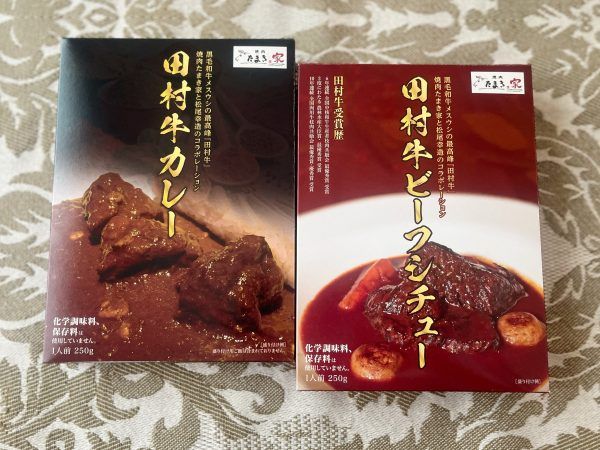 そして、お土産に持ち帰ったのが、「田村牛カレー」と「田村牛ビーフシチュー」(各2700円)。カレーは以前にも食べたことがあるのですが、まさに「お肉を食べるためのカレー」です。
