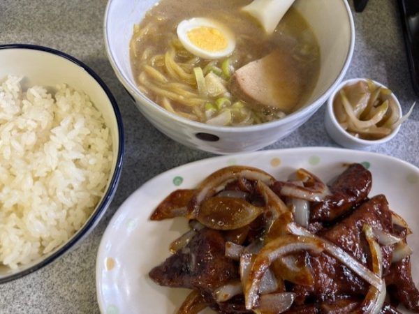 レバーみそ炒め、ライス(おかわり2杯OK)、ミニラーメン、ザーサイ付(1000円)