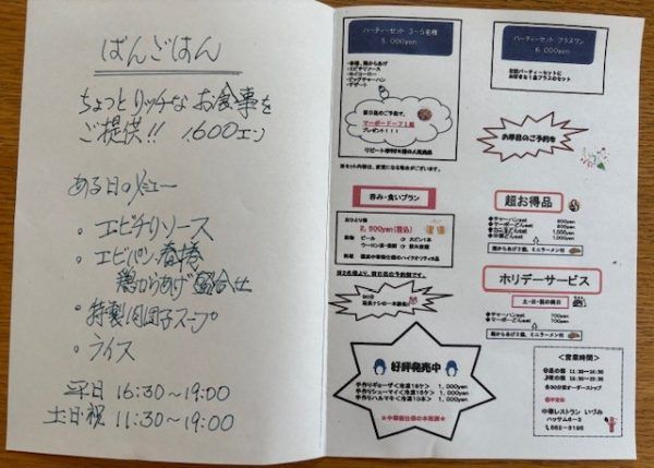 手書きのメニューもいいですね♪ばんごはんに、ホリデーサービスに、ちょい飲みも♪おいしいだけでなく、話も弾み、団らんご飯のひと時を過ごせそうです♪とっても残念ながらお二人の顔出しはNGでしたので、ぜひ食べに、会いに行ってみてください。