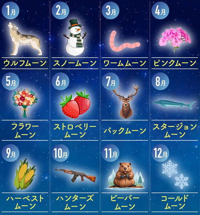 バックムーン以外にも満月には名前があります。1月から12月の満月の名称を紹介します。